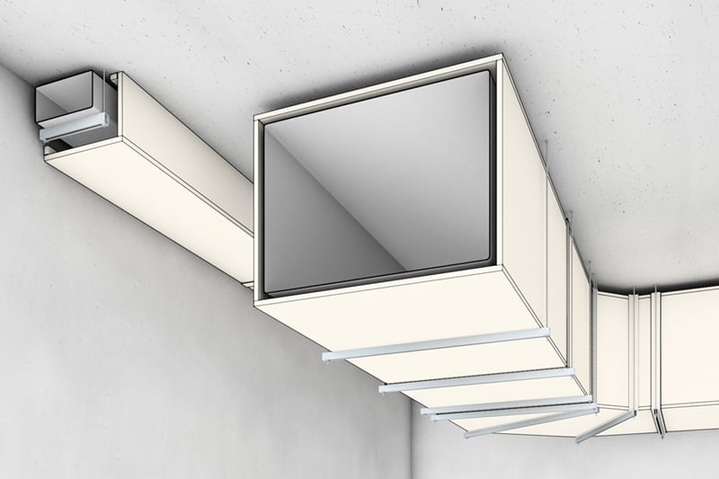 Eine besonders wirtschaftliche Ausführung mit Brandschutzplatten als luftführendem Querschnitt sind selbständige Lüftungsleitungen. Die spezifischen Platteneigenschaften von PROMATECT® und die besondere Fügetechnik erlauben die Herstellung sehr großer und freier Querschnitte mit strömungstechnisch günstigen Formteilen. Einzelne Kanalteile lassen sich sowohl vorkonfektionieren als auch vor Ort sehr gut an individuelle Einbausituationen anpassen. Selbständige Lüftungskanäle benötigen keine besonderen Vorkehrungen gegen Ausdehnung unter Brandeinwirkung (zum Beispiel Kompensatoren) und sind während der gesamten Nutzungsdauer wartungsfrei.