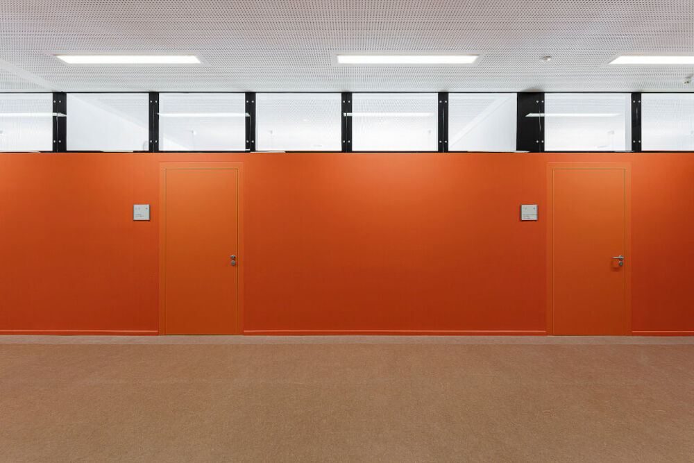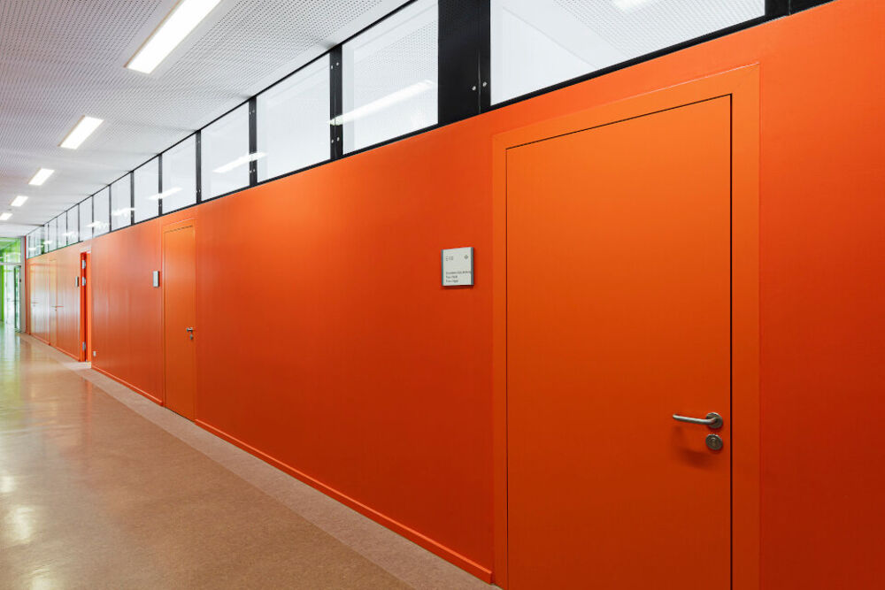 Im Verwaltungstrakt der 1975 erbauten Realschule Neubiberg sollte es moderner und repräsentativer werden. Vor allem die behördlichen Anforderungen an den Brandschutz erforderten bauliche Anpassungen. Das Hauptgebäude war bereits 2009 um einen Erweiterungsbau ergänzt und sukzessive modernisiert worden. Jetzt nahm sich Planer Heinz Zettner den Flur vor, auf dem sich unter anderem das Büro des Schuldirektors befindet. „Der Verwaltungstrakt ist die zentrale Anlaufstelle und das Herz der Schule“, erklärt der Planer Zettner. „Der gestalterische Anspruch war entsprechend hoch.“ Die Farbgebung orientiert sich am Farbkonzept des Erweiterungsbaus, der Flur erstrahlt jetzt in einem leuchtenden Orange.