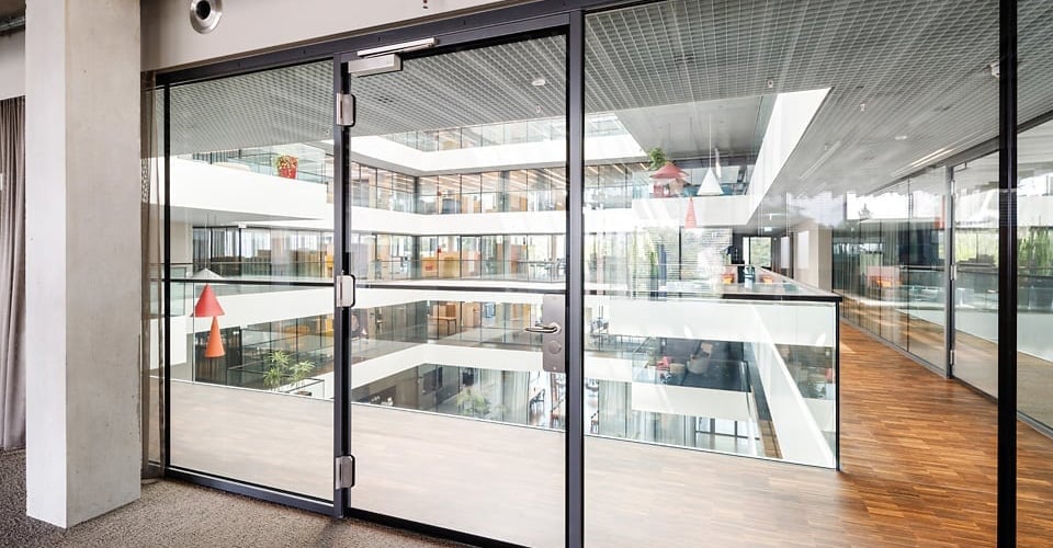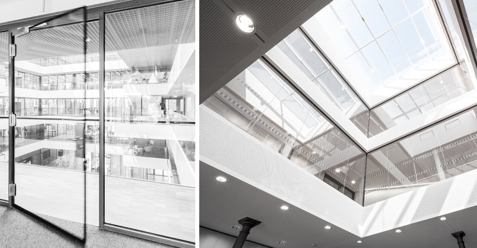 Moderne Verglasungslösungen ermöglichen sowohl besten Brandschutz als auch spannende Architektur. Die Basis hierfür sind innovative Glastechnologien und Produkte mit einem hochwertigen, individualisierbaren Design – zum Beispiel raumhohe und beliebig lange Ganzglaswände ganz ohne Pfosten und Riegel, die mit rahmenlosen Anschlüssen an Wände und Decken beeindrucken. Lediglich unauffällige Silikonfugen verbinden die einzelnen Scheiben.