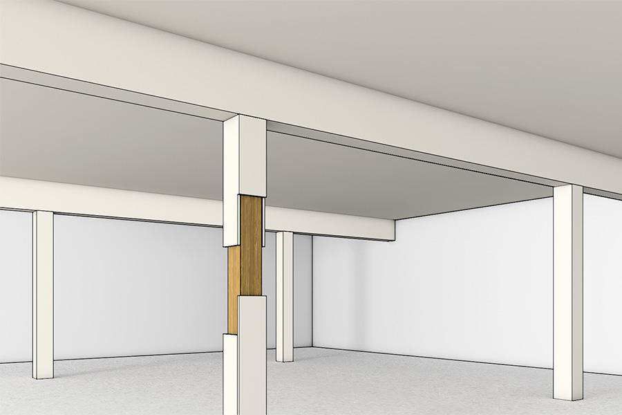 Die geprüften Bekleidungsdicken ermöglichen den Schutz von Holzstützen mit sehr geringen Querschnitten. Da die Platten ohne Abstand und direkt in der Stütze befestigt werden können, bleibt in diesen Fällen der ursprünglich schlanke Charakter der Gesamtkonstruktion trotzdem erhalten.