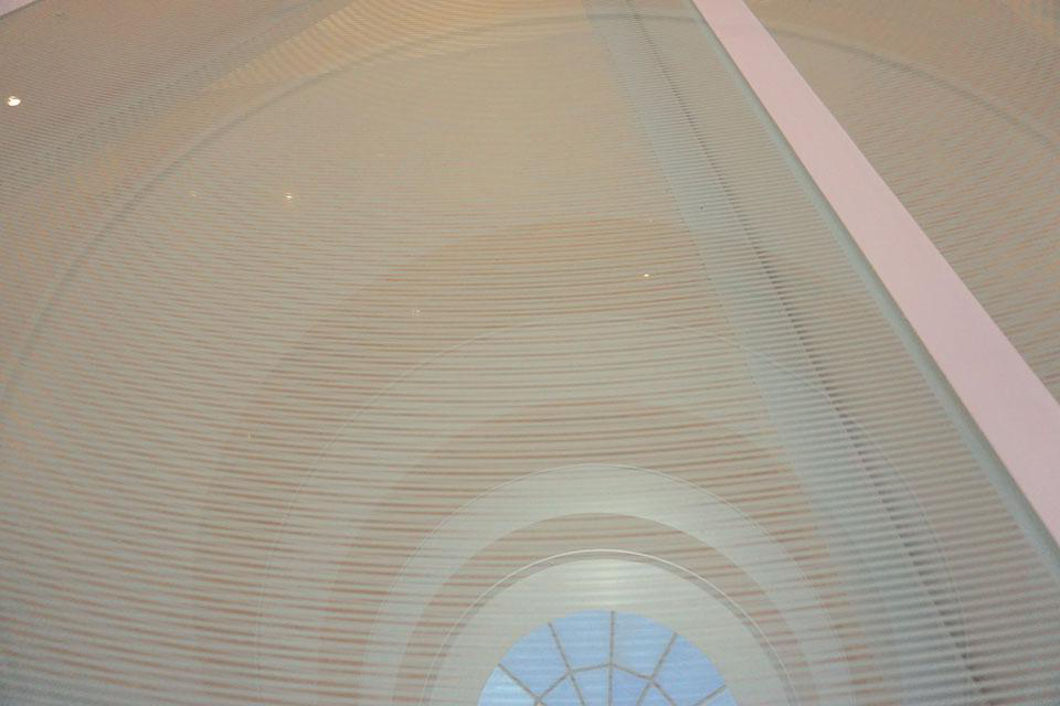 Load-bearing steel structure is protected by lining made of PROMATECT®-H calcium silicate boards. These boards were cemented and grinded to copy the round shape of the structure. Fire glass PROMAGLAS® 30 was embedded into the load-bearing structure, providing fire resistance of EI 30. Each glass was cut to form round shape in compliance with CAD drawings and it was covered by a pattern - 5 mm wide strips. The upper part of the load-bearing structure was covered by a safety glass with the same pattern.