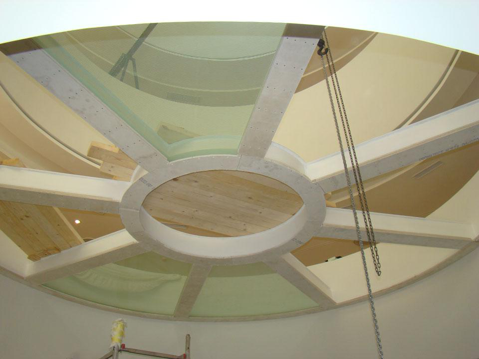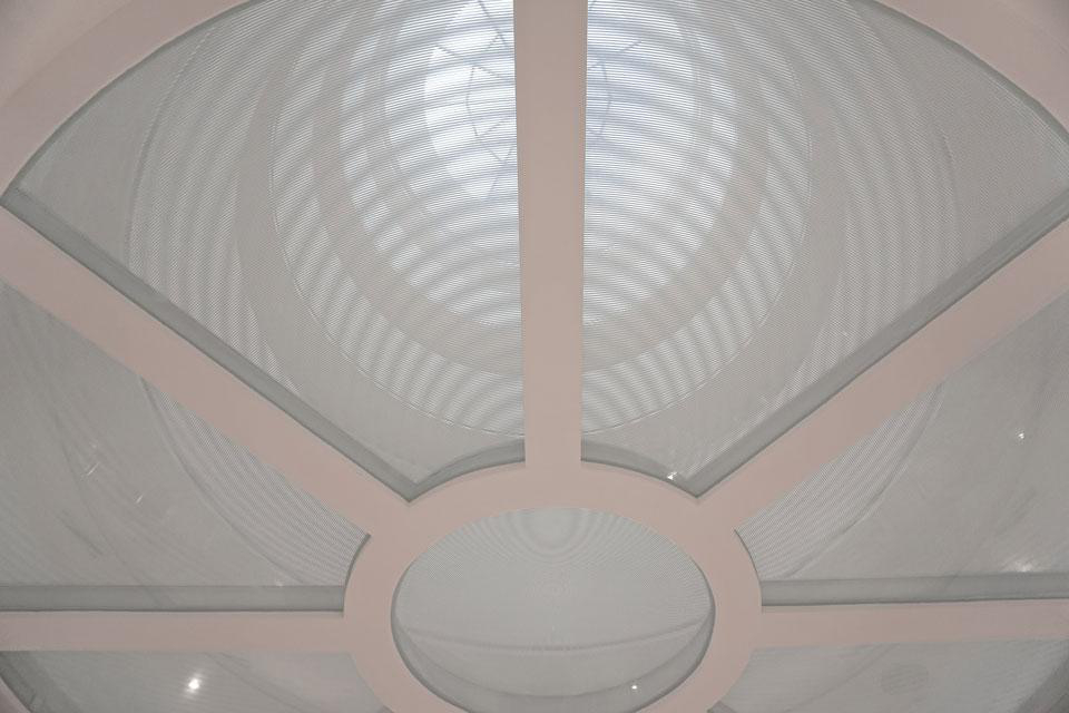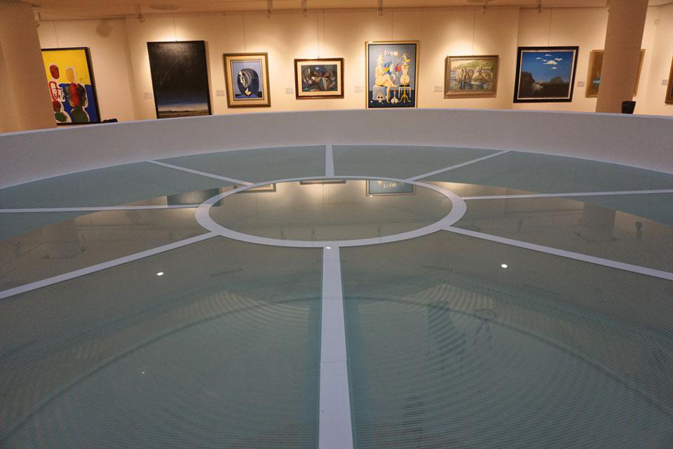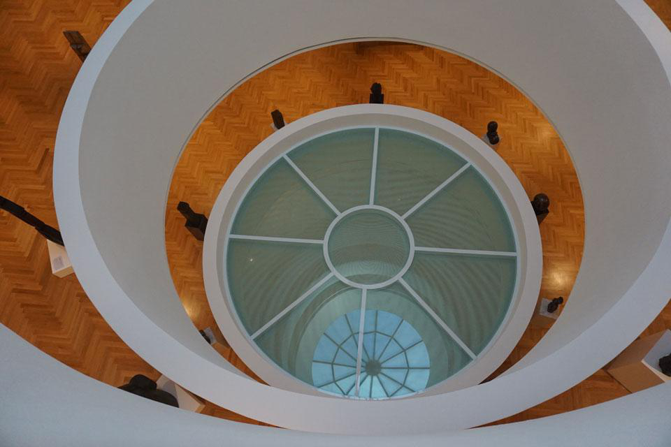 Pieces of fine art are exhibited on five floors in the rear part of the building without windows. There is a large round opening in the roof and in all ceilings for penetration of daylight. The ground floor of the exhibition area creates a separate fire section. In order to maintain lighting of the space, the ceiling is glazes by fire glass. Architecturally exclusive place required an attractive solution. A circle with diameter of 6 m was divided into 9 parts. There is a smaller circle in the middle and there are 8 regular segments around it.