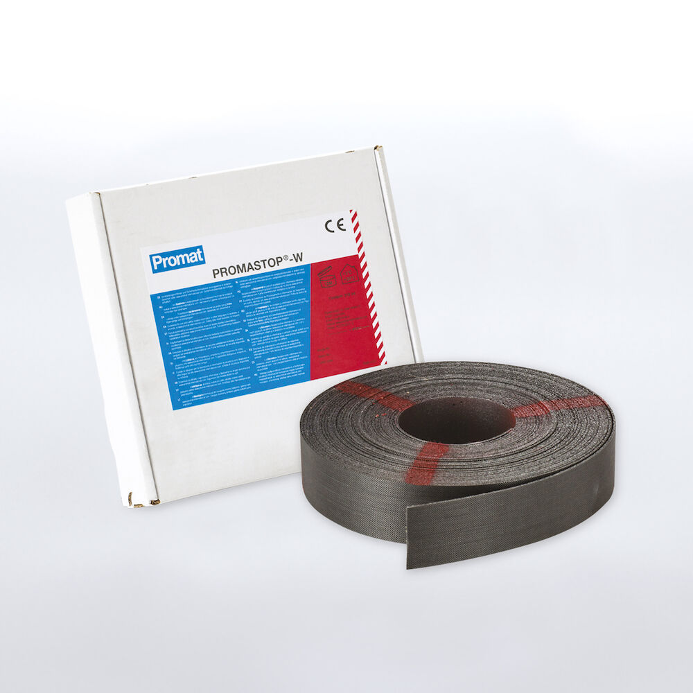 PROMASTOP®-W est une bande d’obturation résistante au feu expansible, disponible sur rouleau, destiné à l’obturation résistante au feu de traversées de murs et dalles massifs, cloisons légères, cloisons de doublage et cloisons et planchers en CLT par des conduites en matière synthétique monocouches, multicouches et alu-composites avec ou sans isolation combustible et des conduites métalliques avec isolation combustible. La bande PROMASTOP-W doit être coupée sur mesure et fixée autour de la conduite à l'aide de bande adhésive. La longueur de la bande et le nombre d'enveloppements sont en fonction du diamètre de la conduite et de la résistance au feu demandée. PROMASTOP®-W rétablit la résistance au feu du compartiment de EI 30 à EI 120 (U/U ou U/C), en fonction de l'application. Ce manchon résistant au feu a été testé dans différentes constructions suivant la norme européenne EN 1366-3:2009.