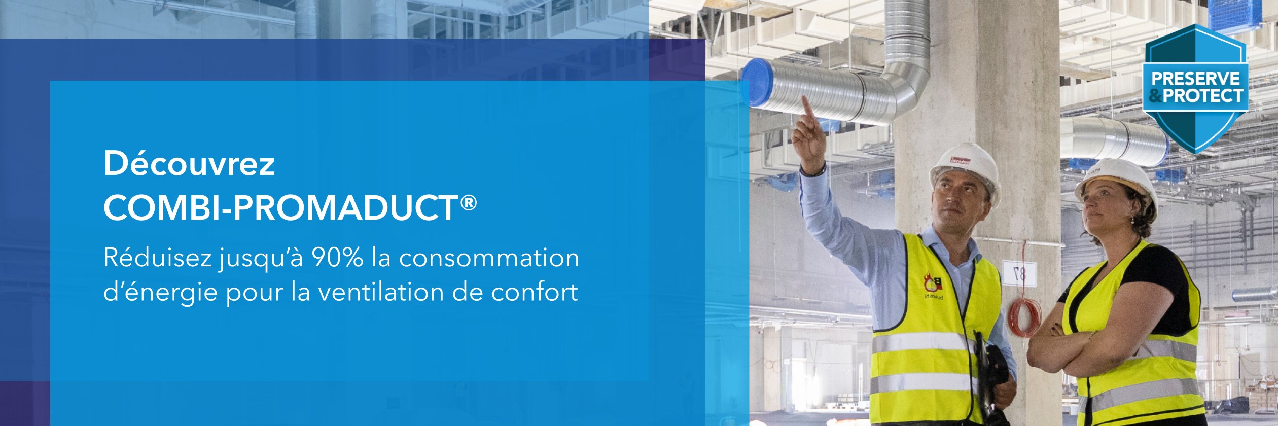 Si la conception de votre bâtiment nécessite un système de désenfumage, nous vous conseillons d’opter pour COMBI-PROMADUCT®. Ce conduit de désenfumage innovant fonctionne également comme conduit de ventilation de confort. Dans des conditions quotidiennes normales, ce conduit de ventilation peut réduire jusqu'à 90 % la consommation d’énergie du ventilateur.