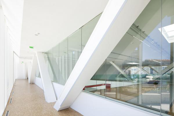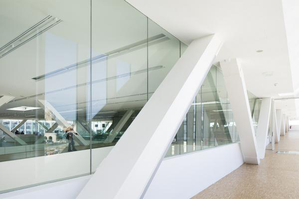 Cette spectaculaire plate-forme d’échanges et de découvertes de 10 000 m² est une véritable prouesse architecturale : étages immergés ou entre ciel et mer, avec comme point culminant un porte-à-faux de 40 mètres. Cet espace sommital très lumineux, d’une grande capacité d’accueil, est dédié aux expositions thématiques. Il fallait que l’audace architecturale soit encadrée de tous les facteurs de sécurité incendie pour ses visiteurs. Une coursive destinée à la visite et à l’évacuation du public a ainsi été réalisée le long du porte-à-faux. Toute sa paroi intérieure est équipée de cloisons vitrées résistantes au feu Promat®-SYSTEMGLAS (EI 60), sans montant ni traverse intermédiaires.