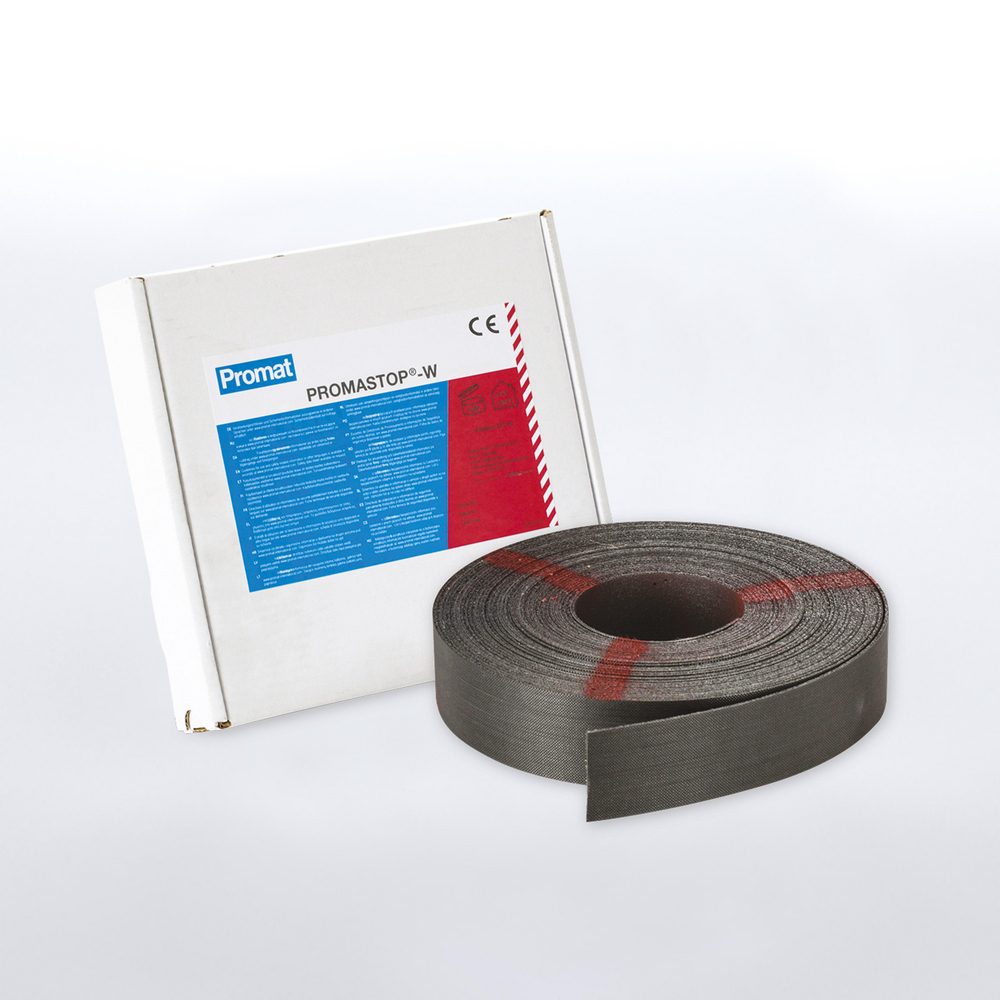 PROMASTOP®-W est une bande d’obturation résistante au feu expansible, disponible sur rouleau, destiné à l’obturation résistante au feu de traversées de murs et dalles massifs, cloisons légères, cloisons de doublage et cloisons et planchers en CLT par des conduites en matière synthétique monocouches, multicouches et alu-composites avec ou sans isolation combustible et des conduites métalliques avec isolation combustible. La bande PROMASTOP-W doit être coupée sur mesure et fixée autour de la conduite à l'aide de bande adhésive. La longueur de la bande et le nombre d'enveloppements sont en fonction du diamètre de la conduite et de la résistance au feu demandée. PROMASTOP®-W rétablit la résistance au feu du compartiment de EI 30 à EI 120 (U/U ou U/C), en fonction de l'application. Ce manchon résistant au feu a été testé dans différentes constructions suivant la norme européenne EN 1366-3:2009.