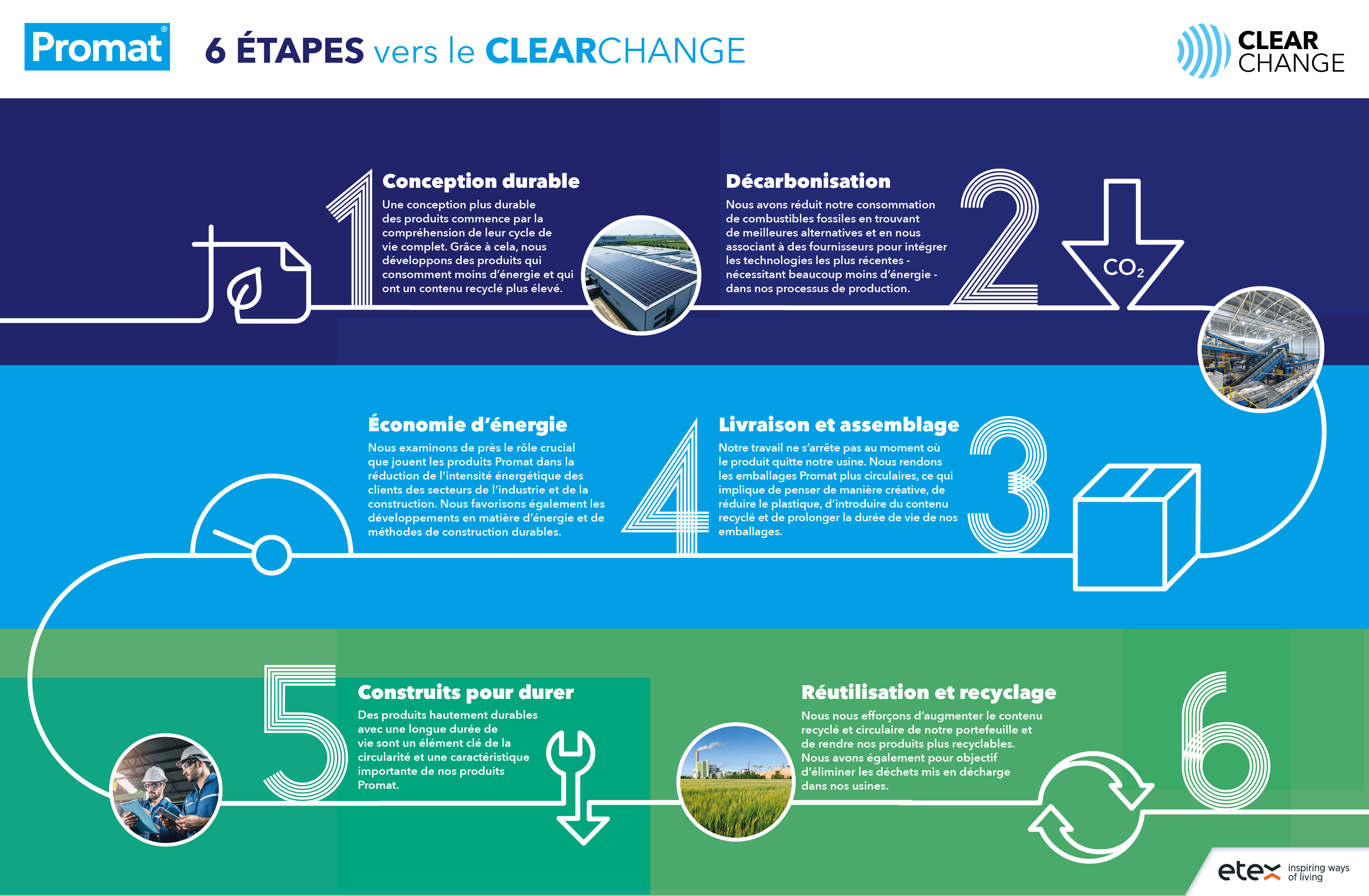 Chez Promat, nous voulons jouer un rôle proactif pour un avenir durable. Non seulement nous soutenons les méthodes de construction et d'énergie durables, mais nous développons également un portefeuille de produits de plus en plus durables. En tant que membre du groupe Etex, nous disposons de l'expertise nécessaire. Et avec ClearChange™, nous suivons la voie clairement vers un portefeuille plus circulaire et des émissions de carbone plus faibles. Nous nous concentrons sur 6 points essentiels pour réduire notre empreinte environnementale et aider nos clients à construire de manière durable.