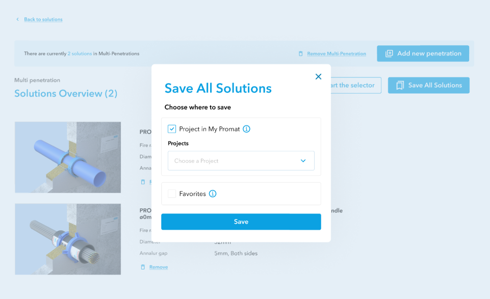 Se sei un utente dell'area riservata MyPromat, puoi salvare le soluzioni nei progetti da te creati.
