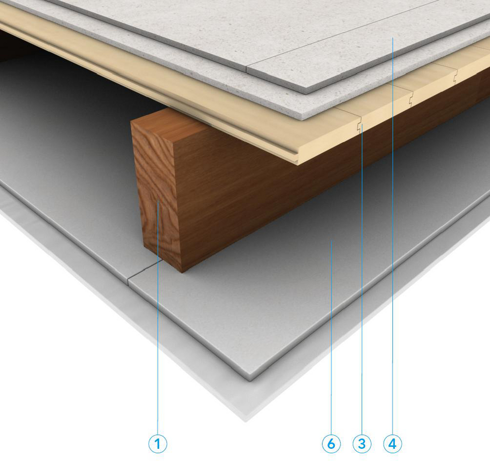 ®-100, d = 2 x 15 mm. De platen van beide lagen worden met verspringende voegen aangebracht aan de onderzijde van de dragende houten vloerconstructie en rechtstreeks in de houten draagbalken bevestigd d.m.v. schroeven min. Ø 3,5 x 55 mm voor de eerste laag en min. Ø 3,5 x 70 mm voor de tweede laag, aangebracht met een max. tussenafstand van 200 mm. De dwarse voegen tussen de platen bevinden zich (a) ter plaatse van de houten balken met asafstand max. 500 mm en de langse voegen worden niet bijkomend afgedekt of (b) de langse voegen tussen de platen bevinden zich ter plaatse van de houten balken met asafstand max. 400 mm en de dwarse voegen worden niet bijkomend afgedekt.