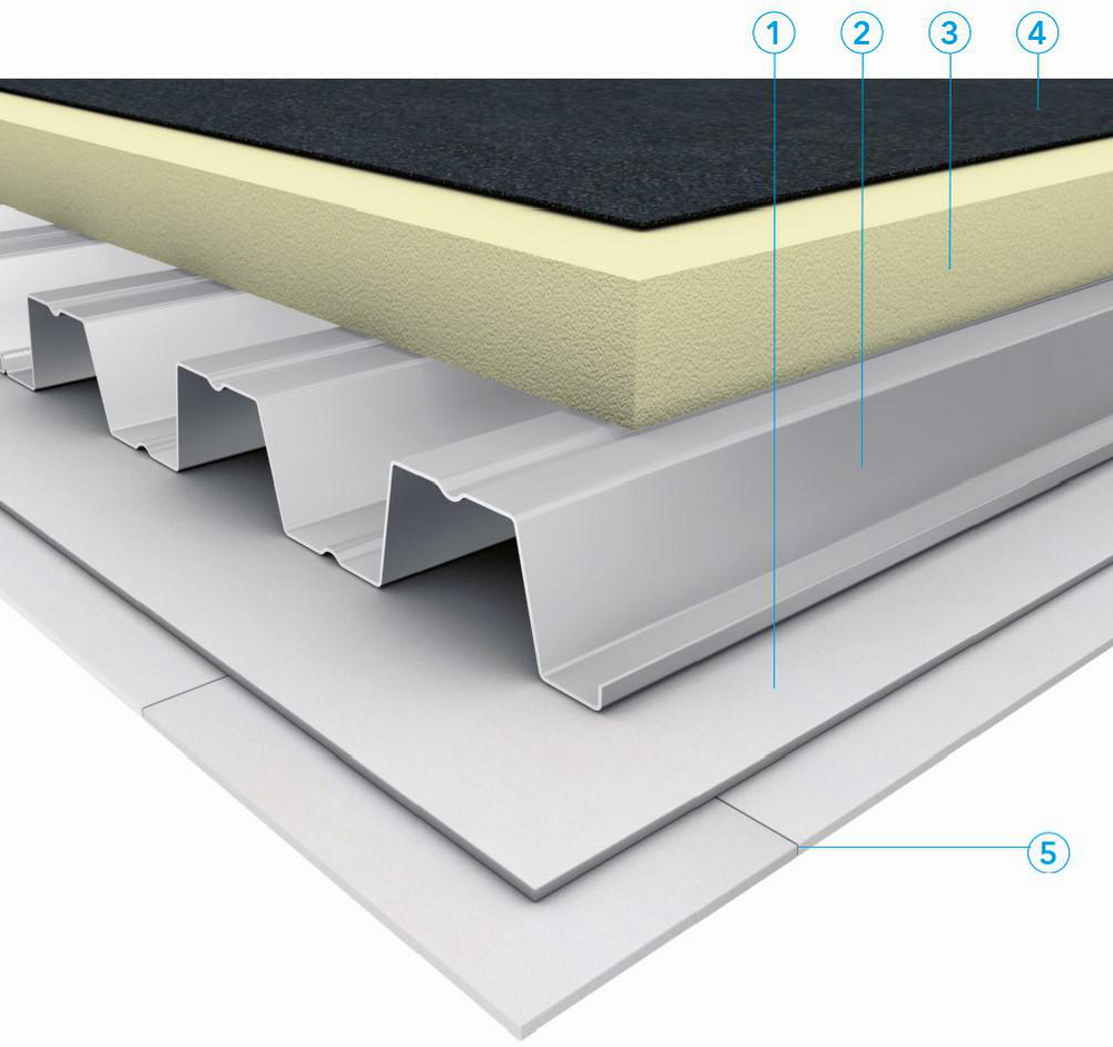 2. Geprofileerde staalplaat in gegalvaniseerd staal, d = min. 0,75 mm, h = min. 106 mm, asafstand ribben = max. 250 mm, op min. 2 steunpunten geplaatst. Aanliggende geprofileerde staalplaten moeten overlappend worden aangebracht. De stabiliteit van de dakconstructie moet gegarandeerd zijn bij omgevingscondities volgens de geldende normen.