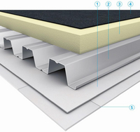 3. PUR-isolatieplaat, d = min. 100 mm, densiteit min. 30 kg/m³, op de geprofileerde staalplaten aangebracht en bevestigd d.m.v. stalen schroeven met S-punt, min. Ø 4,8 x 150 mm, aangebracht à rato van min. 4 schroeven/m².