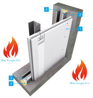 1. PROMATECT®-100, dikte 2 x 15 mm, geplaatst met verspringende horizontale en verticale plaatnaden. De verticale naden tussen de platen bevinden zich ter plaatse van de verticale stijlen. De platen bevestigt u aan één zijde tegen de stalen profielen d.m.v. snelbouwschroeven minimaal Ø 3,5 x 35 mm, aangebracht met een maximale hart-op-hart afstand van 250 mm voor de eerste laag en snelbouwschroeven minimaal Ø 3,5 x 55 mm, aangebracht met een maximale hart-op-hart afstand van 250 mm voor de tweede laag.