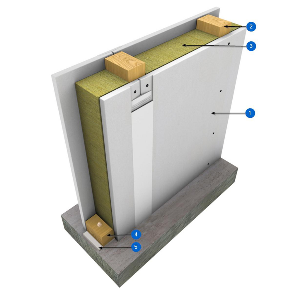 Niet-dragende wand met houten stijlen minimaal 44 x 69 mm met één laag PROMATECT®-100 platen dikte 10 mm aan beide zijden van de houten stijlen. In de spouw wordt steenwolisolatie aangebracht. De wand heeft een maximale hoogte van 4 m.