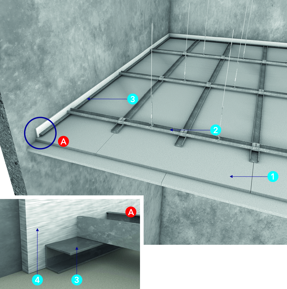 Afgehangen zelfstandig brandwerend plafond met twee lagen PROMATECT®-100 platen dikte 25 mm op een dubbele, gekruiste stalen draagstructuur, opgehangen met noniushangers. De brandwerendheid is beoordeeld met een brand van onderaf.