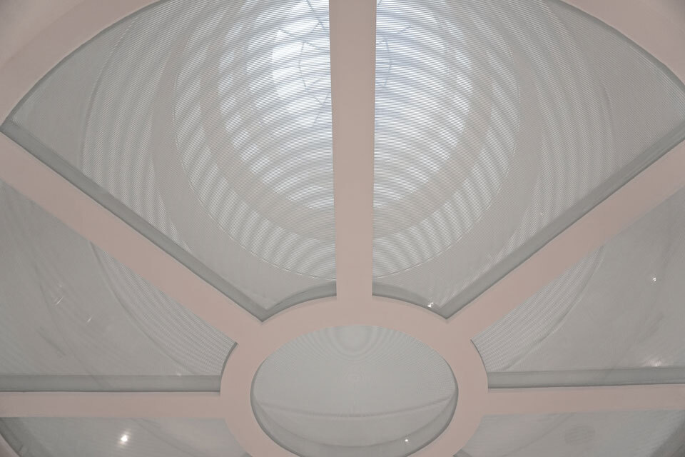 Structura portantă din oțel este protejată cu plăci din silicat de calciu PROMATECT®-H. Aceste plăci au fost cimentate și șlefuite pentru a copia forma rotundă a structurii.Geamurile rezistente la foc PROMAGLAS® 30 au fost încorporate în structura portantă, conferind rezistență la foc EI 30. Fiecare sticlă a fost tăiată pentru a se realiza forma rotundă, în conformitate cu schițele CAD și a fost acoperită de un model de benzi late de 5mm. Partea superioară a structurii portante a fost acoperită de un geam de siguranță cu același model.