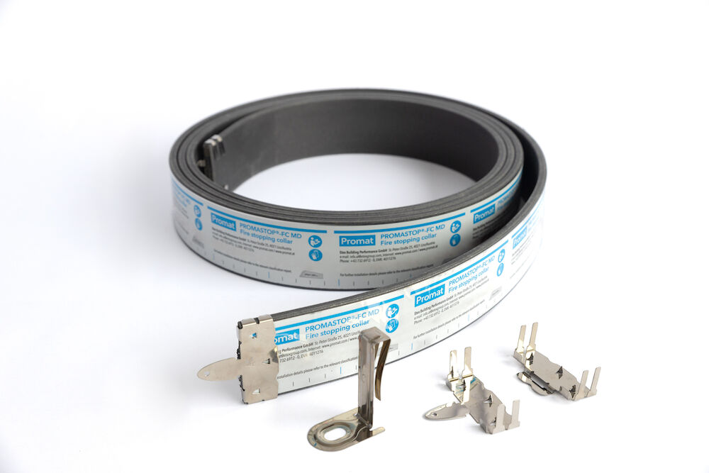 PROMASTOP®-FC MD je požarna manšeta s posebnim intumescentnim vložkom in prevleko iz nerjavnega jekla, namenjena požarni zatesnitvi plastičnih cevi različnih premerov. Manšeta je preizkušena v skladu s standardom EN 1366-3 za odprte konfiguracije koncev cevi (U/U) premera do 125 mm.
